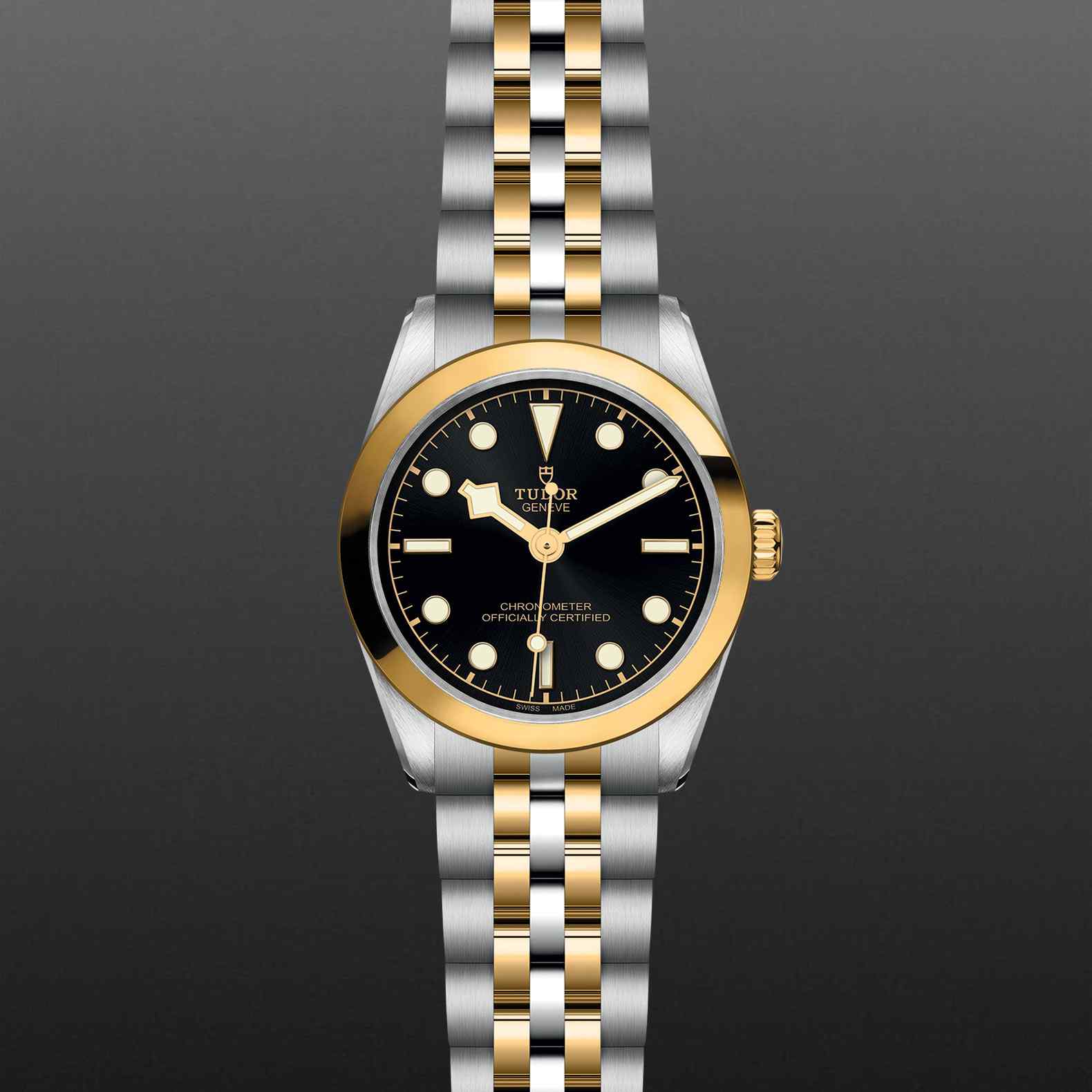 Screw-down winding crown with the TUDOR rose in relief. Steel covered by a 0.1mm 18 ct yellow gold cap
