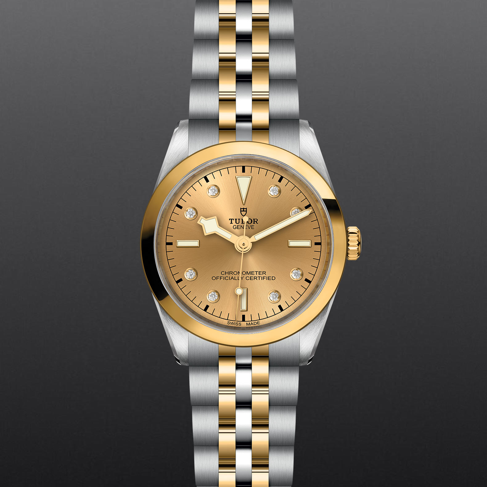 香槟色装饰纹平面表盘,镶钻钟点标记